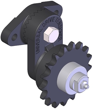 This particular single adjusting model incorporates the compactness of a flanged base with the versatility of a rotating arm. Both base and arm have serrated teeth to prevent slippage. As a chain or belt elongates, the arm, which rotates 360°, can be readjusted to restore the original tension.
