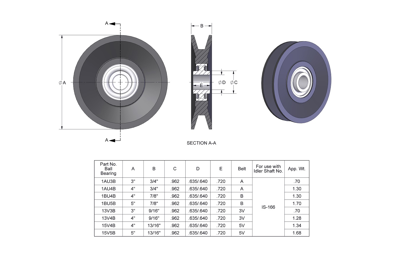| Part No. Ball Bearing | A | B | C | D | E | Belt | For use with Idler Shaft No. | Appt. Wt. | Downloads | |||